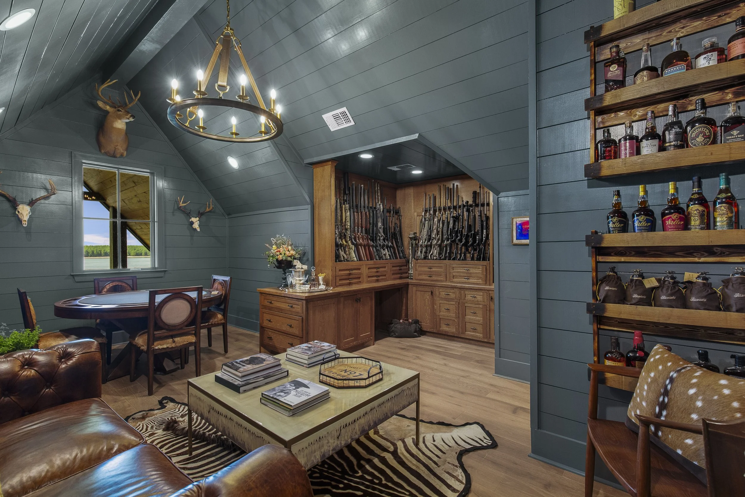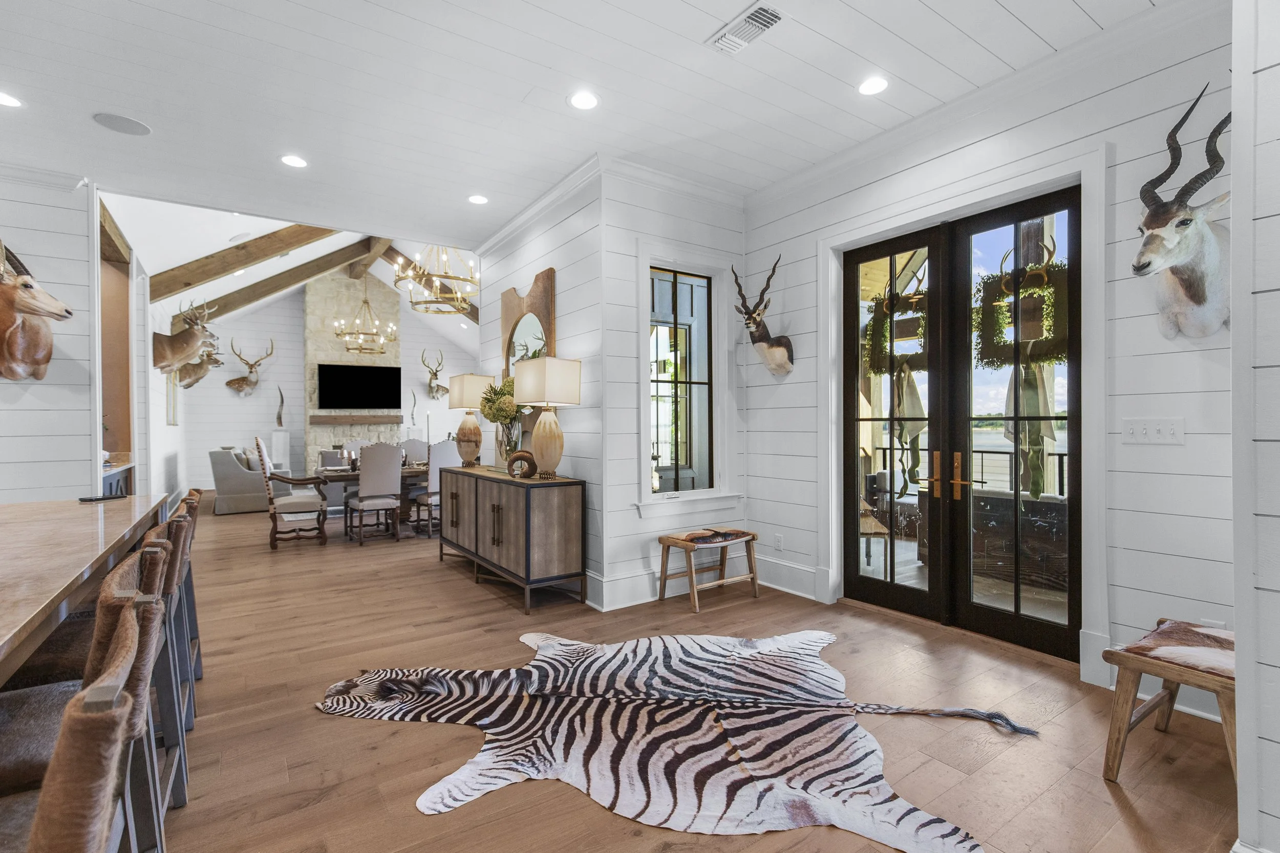 The Suares family has always shared a deep passion for hunting, and Paige was always ready to step in whenever she was needed. Over the years, their adventures have taken them far beyond the Mississippi Delta. From dove and duck to deer, turkey, bear, and even alligator, the Suares men, and one determined lady, have pursued it all. Many of the trophies from these hunts now adorn the interior, each a reminder of time spent in the field. More recently, Paige and Neal have discovered a shared love for exotic game hunting in Texas. Several of the striking mounts displayed throughout the cabin are mementos from those trips “each one has a story,” Neal says. “And this cabin is where we relive them all.”